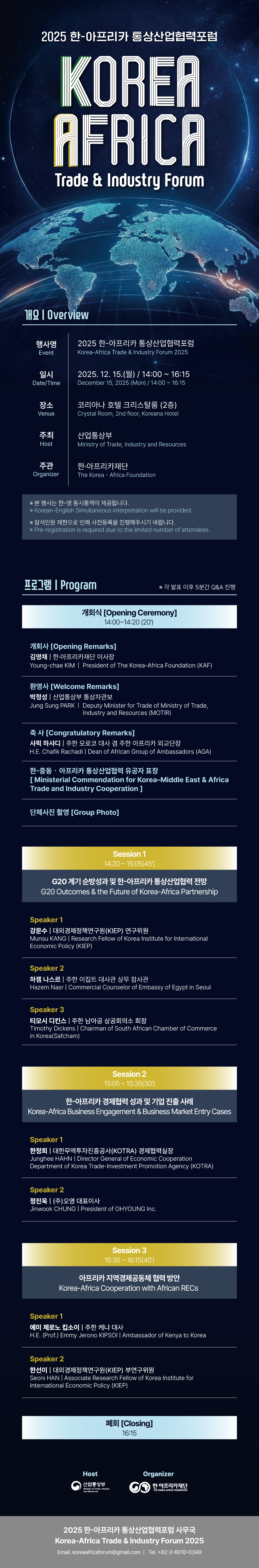 한국과 아프리카의 새로운 경제 협력의 지평을 여는 2025 한-아프리카 통상산업협력포럼에 여러분을 초대합니다! 산업통상부 주최, 한·아프리카재단 주관으로 12월 15일 월요일 서울 코리아나 호텔에서
