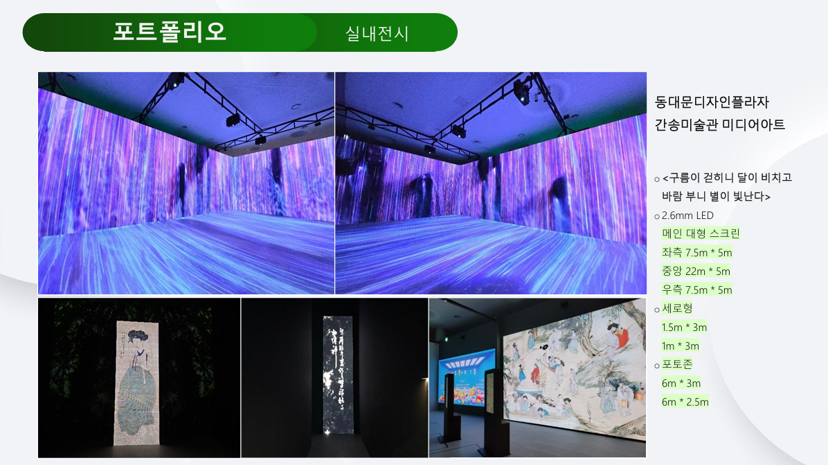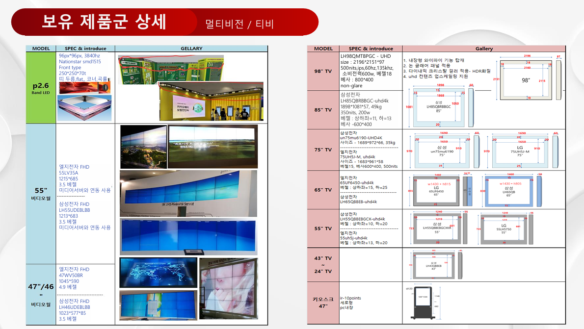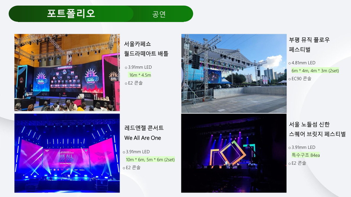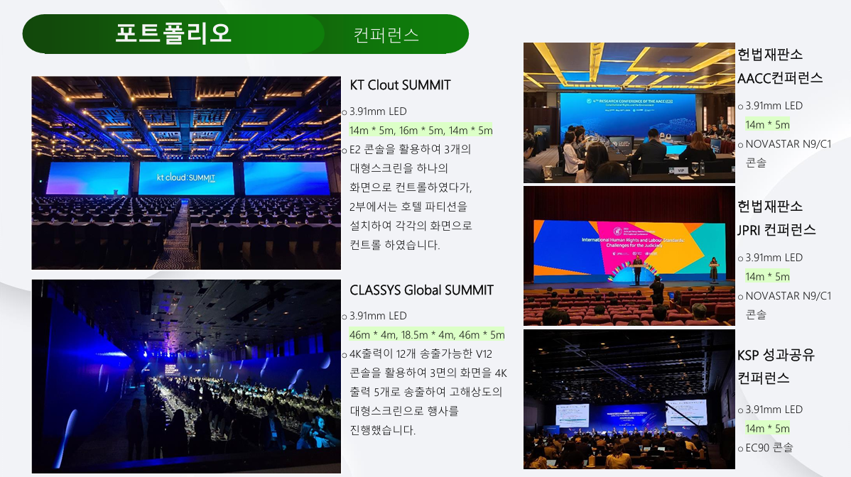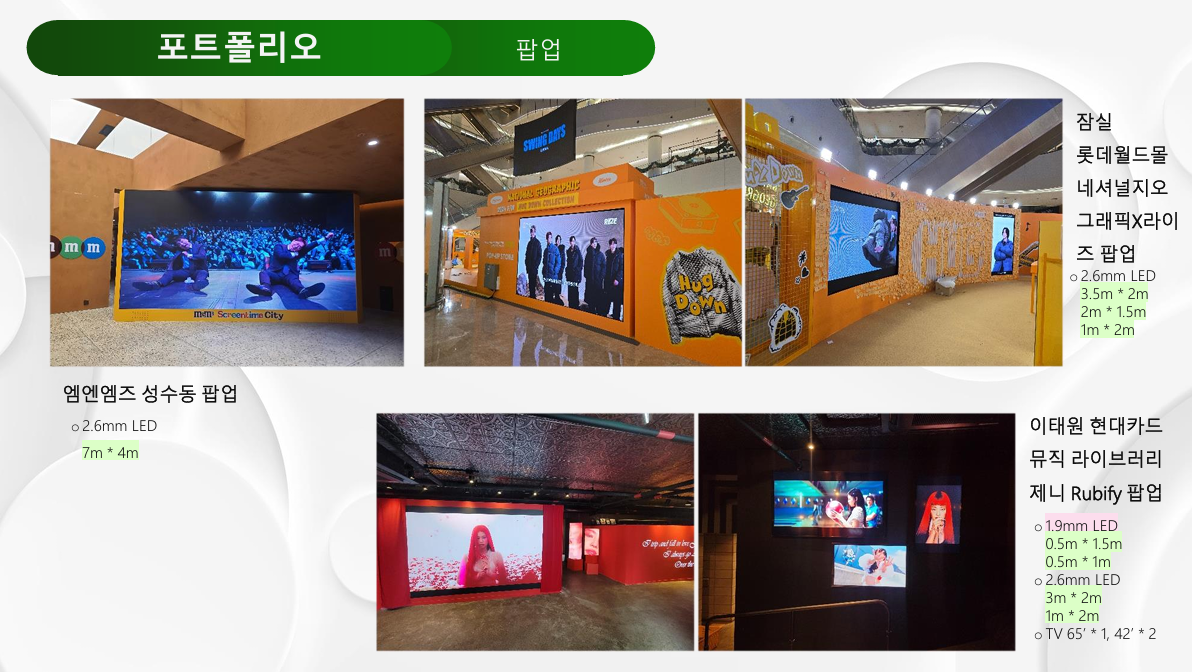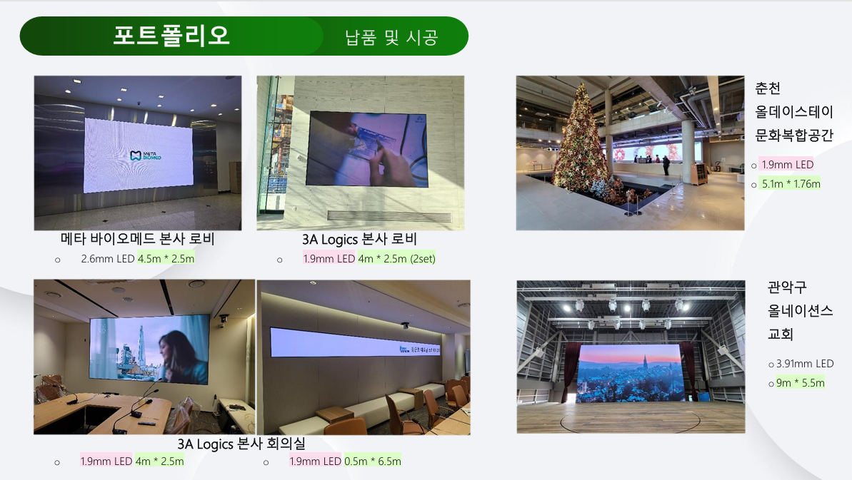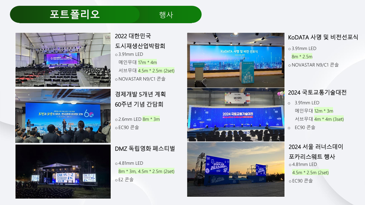 ✔ P1.5mm / P1.9mm / P2.6mm / P3.9mm 등 실내외 고해상도 LED 5,000장 이상 보유