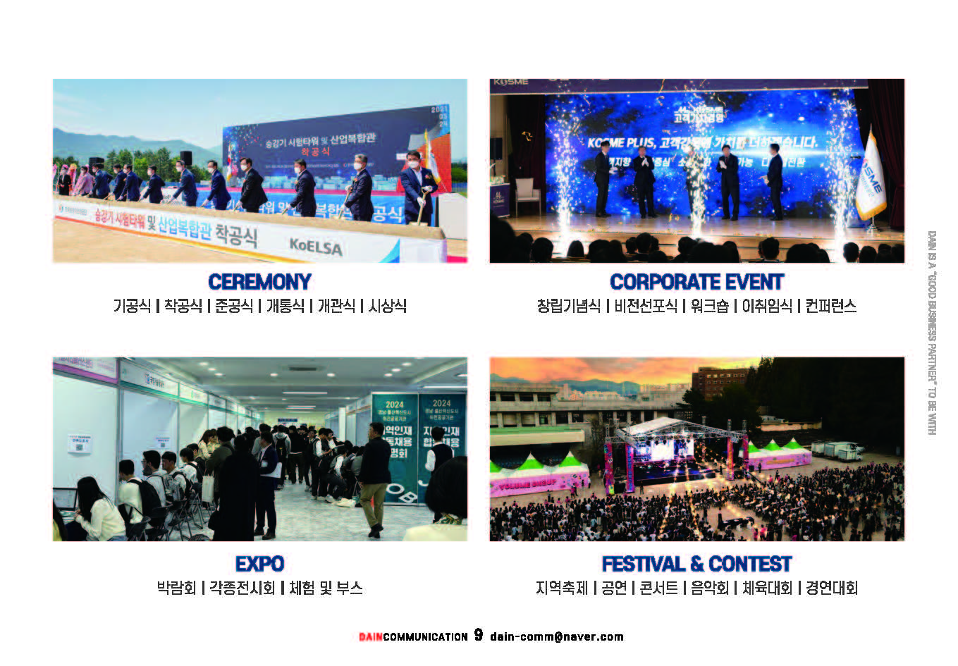 행사기획, 전시, 공연, 지역축제, 광고디자인 등 하이브리드 행사를 기획하여 행사의 품격을 높이는데 기여하겠습니다.